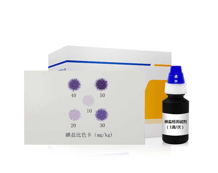 碘與碘鹽試劑反應產生顏色,顏色深淺與碘含量成正比,與標準比色卡對比可確定碘含量。