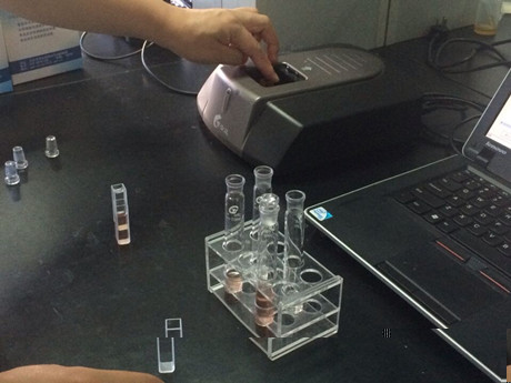 3、 樣品管:分別取0.4mL樣品液于10mL比色管中,做平行測試,分別加B溶液1mL、C溶液0.2mL,混勻,加D溶液0.4mL,搖勻,再加E溶液0.4mL,立即用蒸餾水稀釋至5mL刻線,搖勻,靜置20min,進行檢測。空白管:不加E溶液,其余步驟與樣品管同。