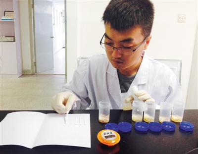 結(jié)果顯示6種樣品的試紙顏色都沒有發(fā)生變化?!皼]有變色,說明這些泡椒鳳爪里都不含違禁的雙氧水”,于勇說,如果試紙變成藍(lán)綠色,才有可能加了雙氧水,試紙顏色越深,含量越高。