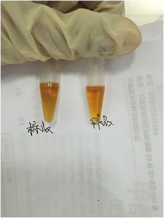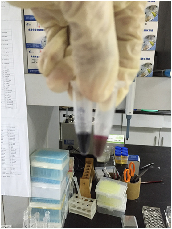 用滴管取0.04%甲醇標(biāo)液、酒樣各6滴于兩個(gè)離心管中,各加入5滴試劑1,放置5分鐘。