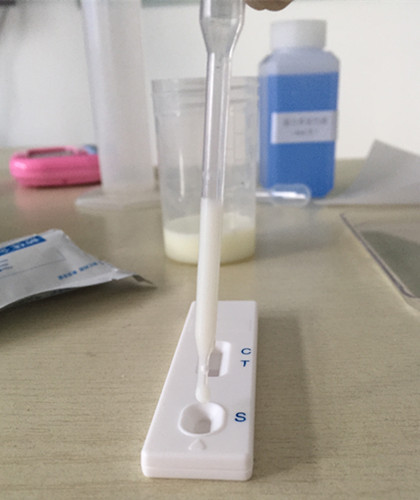 用干燥、潔凈的比色管盛放奶粉,用純凈水1:10稀釋?zhuān)?份奶粉+10份純凈水),溶解后用于檢測(cè)。